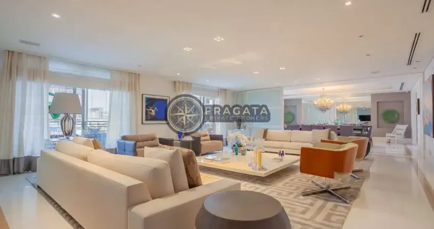 Com 613m² de área útil, este apartamento de altíssimo padrão combina elegância, amplitude e conforto em cada detalhe. O living, revestido em mármore e madeira, acomoda vários ambientes integrados e cercados por varandas espaçosas que proporcionam excelente iluminação natural e uma vista privilegiada.