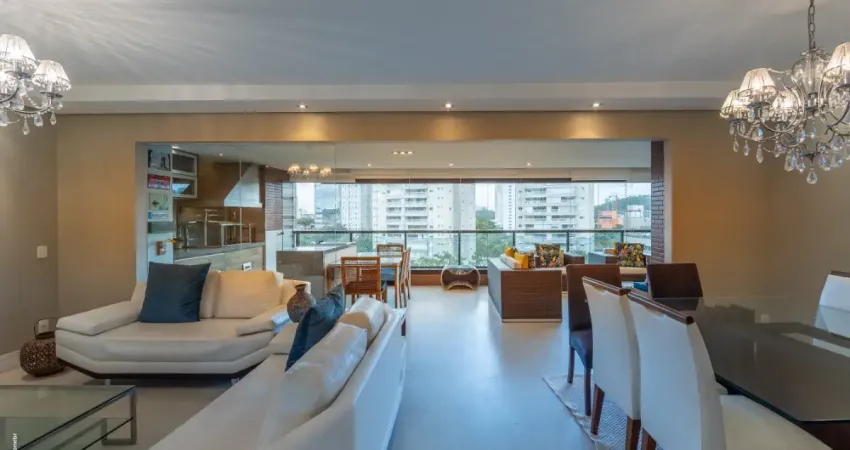 Situado em andar médio e com hall privativo, o imóvel oferece uma área social ampla e integrada. A sala para dois ambientes conecta-se harmoniosamente à varanda gourmet com churrasqueira, criando um espaço perfeito para receber amigos e familiares com sofisticação. O ambiente é finamente decorado, com piso em porcelanato, automação completa de áudio, vídeo e iluminação e ar-condicionado em todos os ambientes, garantindo praticidade e conforto no dia a dia.