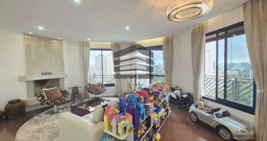 Apartamento reformado, hall social privativo, andar alto, ar condicionado nos principais ambientes, planta original com quatro dormitórios amplos sendo duas suítes, a máster com closet, sacada e hidromassagem, um dormitório foi aberto para sala onde temos uma sala de tv muito aconchegante e outro foi transformado em escritório, fácil reversão, sala de estar com lareira e sala de jantar, varanda com fechamento em vidros e vista espetacular para o Parque Ibirapuera com direito ao por do sol, lavabo, cozinha planejada e janelões, área de serviço, banheiro para funcionário, depósito e duas vagas de garagem fixas.