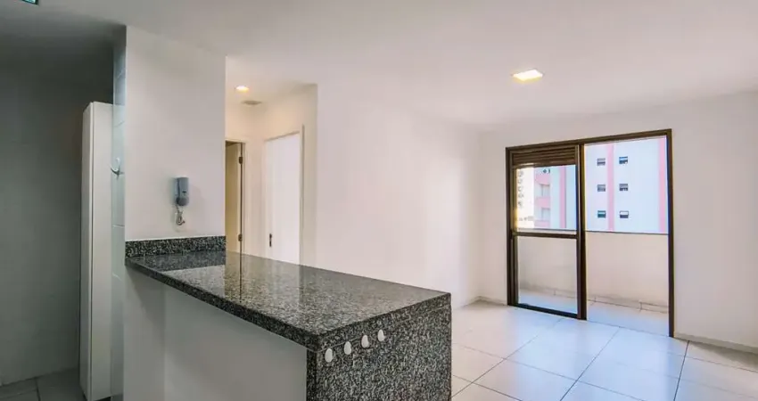 Este apartamento possui uma sala espaçosa com varanda, 1 quarto, banheiro social com blindex e armário, cozinha americana com armários e área de serviço também.