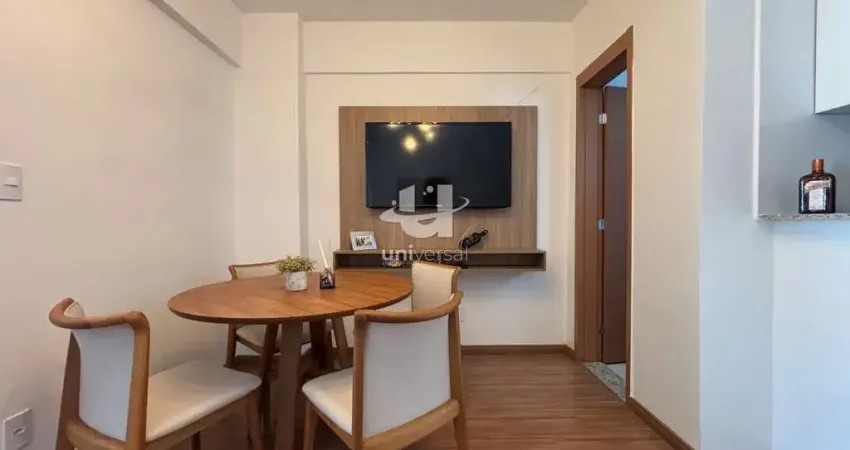 O quarto é mobiliado com guarda-roupa e cama, oferecendo praticidade e conforto. A sala conta com sofá, painel e TV, criando um ambiente acolhedor. A cozinha possui móveis planejados, proporcionando melhor aproveitamento dos espaços, e o banheiro dispõe de armário planejado. O imóvel conta ainda com uma vaga de garagem.