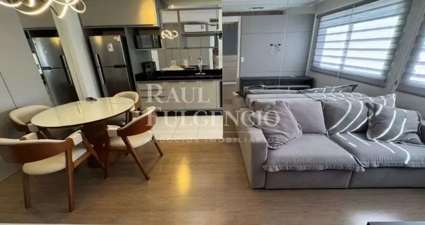 Apartamento 1 quarto suite, mesa redonda com cadeira, maquina de lavar roupa, geladeira, forno, sala com sofa, ar-condicionado, microondas, garagem e armarios planejados.
