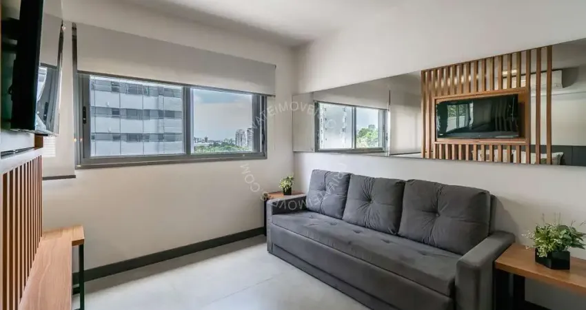 Apartamento mobiliado de 38 m², 1 dormitório, 1 suíte com closet, living 2 ambientes, cozinha americana montada e equipada, churrasqueira e 1 vaga de garagem.