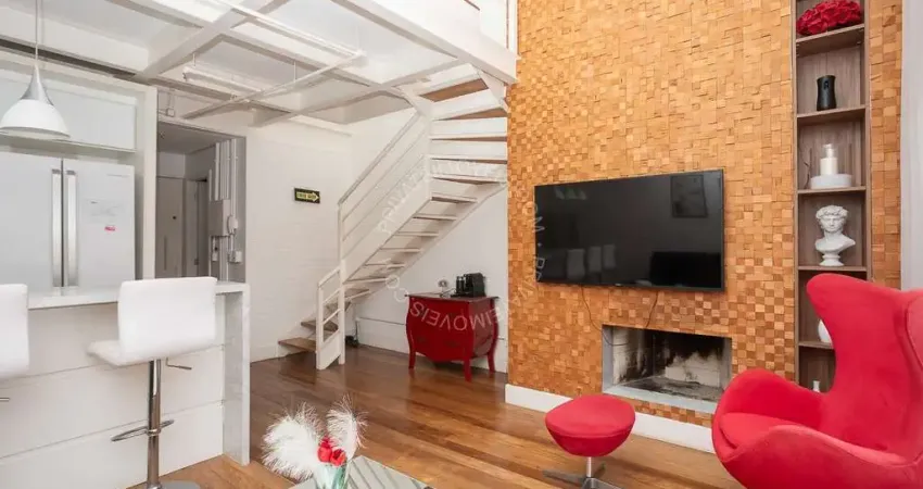 Apartamento Duplex mobiliado de 78 m², 1 dormitório, suíte com hidromassagem, amplo living 2 ambientes com pé direito duplo, sacada, lareira, lavabo, cozinha americana montada e equipada, área de serviço separada e 2 vagas de garagem.