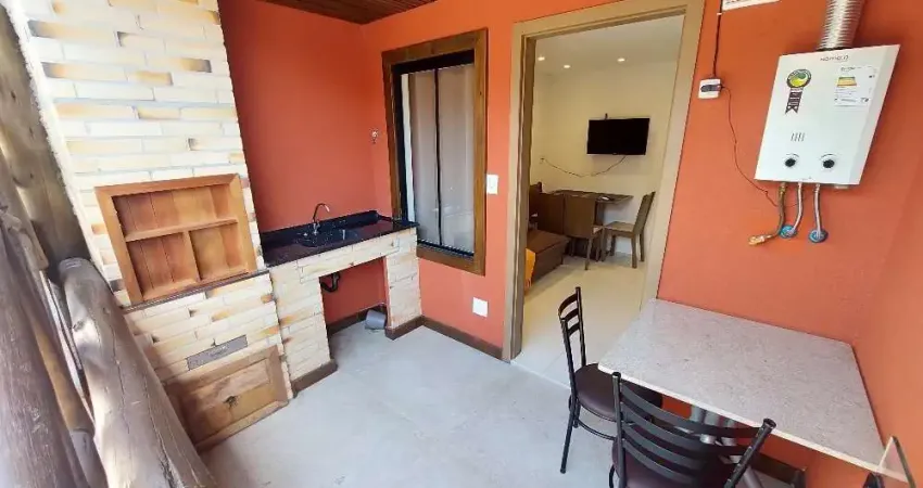 Apartamento com dormitório, sala, cozinha com armários, área de serviço, banheiro social com box de vidro, piso porcelanato e vaga de garagem. Varanda com ótimo espaço e churrasqueira.