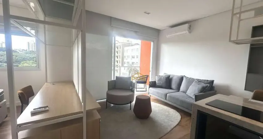 Apartamento mobiliado tipo Studio com 38,5m², 1 quarto, 1 banheiro, ambiente integrado com sala e cozinha, 1 vaga coberta e lavanderia coletiva.