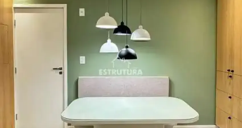 Possui cozinha planejada com cooktop elétrico, geladeira e mesa, 1 W.C social, espaço para sala com sofá e painel e dormitório com cama e guarda-roupa planejado, ar-condicionado e 2 vagas de garagem.
