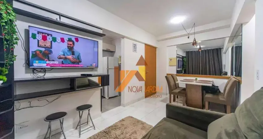 Lindo apartamento com 01 quarto com guarda roupa e cama de casal, sala para 02 ambientes com rack, televisão e canto alemão, cozinha integrada com lavandeira com todos os planejados, fogão, maquina de lavar, 01 banheiro, 01 vaga de garagem coberta.