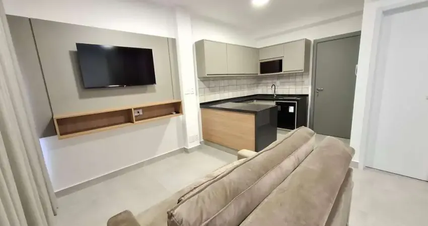 O imóvel conta com cozinha integrada equipada com armários planejados, ar-condicionado, frigobar, microondas e fogão de indução. A sala é aconchegante e dispõe de sofá, painel e TV planejado, proporcionando funcionalidade e elegância ao ambiente.