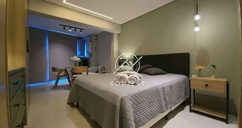 Apartamento de 32m² com 1 suíte, cozinha, terraço, 1 vaga de garagem, mobiliado com móveis planejados, projeto de iluminação, ar condicionado, equipado (geladeira, microondas, cooktop, tv, mesa, cadeiras, sofá a cama box) e com acabamentos de alto padrão.
