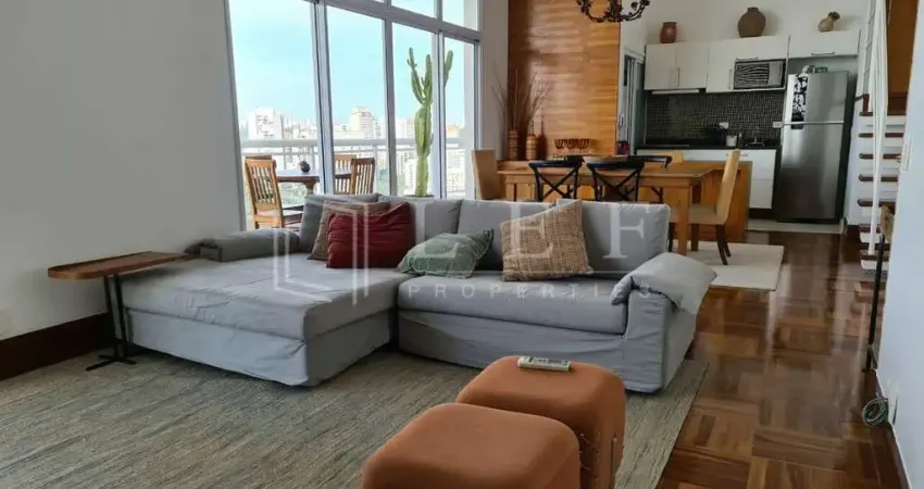 O apartamento, no estilo loft com pé direito duplo, possui suíte, sala e cozinha integrados, além de um lavabo. A decoração é moderna e sofisticada.
