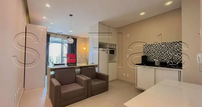 Apartamento totalmente mobiliado no modelo Studio com 35m², 1 dormitório, varanda fechada com vidro, cozinha americana e 1 vaga de garagem.