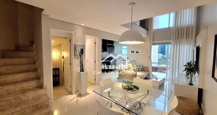 Apartamento duplex mobiliado à venda na Vila Olímpia, na divisa com o Itaim Bibi e a Vila Nova Conceição. Com 77m² de área privativa, o imóvel conta com uma planta moderna e bem distribuída, além de estar 100% mobiliado e decorado, pronto para morar.