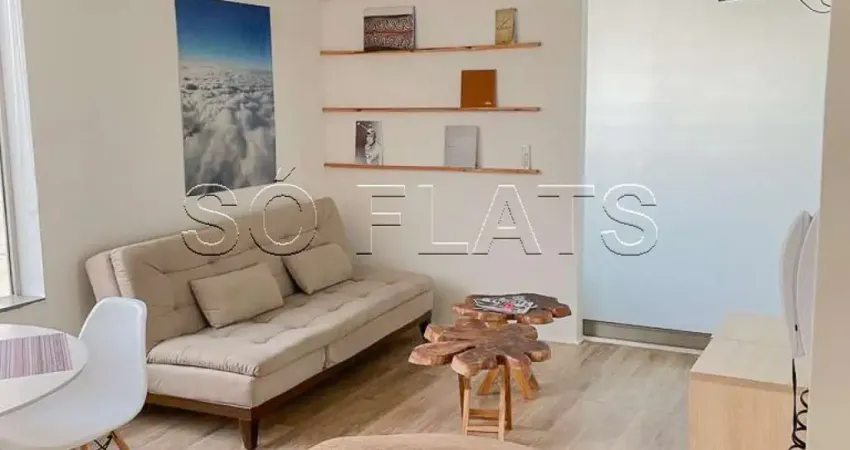 Apartamento mobiliado com 37m², 1 dormitório, cozinha americana, sala compacta e 1 vaga de garagem.