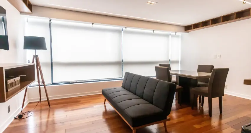 Apartamento duplex mobiliado. O pavimento inferior tem uma sala para 2 ambientes com amplas janelas