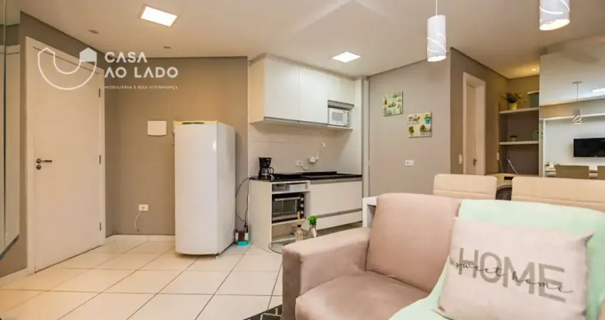 Apartamento mobiliado, com 28m² de área privativa, ideal para quem busca praticidade e conforto. O imóvel conta com uma sala ampla para dois ambientes, equipada com sofá e TV, integrada à sacada, com piso em cerâmica, painel decorativo e excelente iluminação natural.