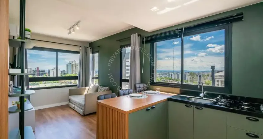 Apartamento mobiliado de 29 m², 1 dormitório, living, banheiro social e cozinha totalmente equipada.