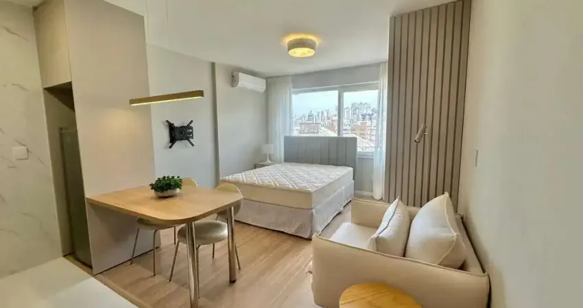 Apartamento de 1 dormitório totalmente mobiliado, pronto para morar, ideal para quem busca praticidade, conforto e uma excelente vivência urbana. O imóvel conta com living aconchegante e bem distribuído, ótima iluminação natural, ar-condicionado, cozinha equipada com eletrodomésticos e armários, além de banheiro com box de vidro. Os ambientes são funcionais e bem planejados, oferecendo conforto no dia a dia. O edifício dispõe de elevador, garantindo mais comodidade à rotina.