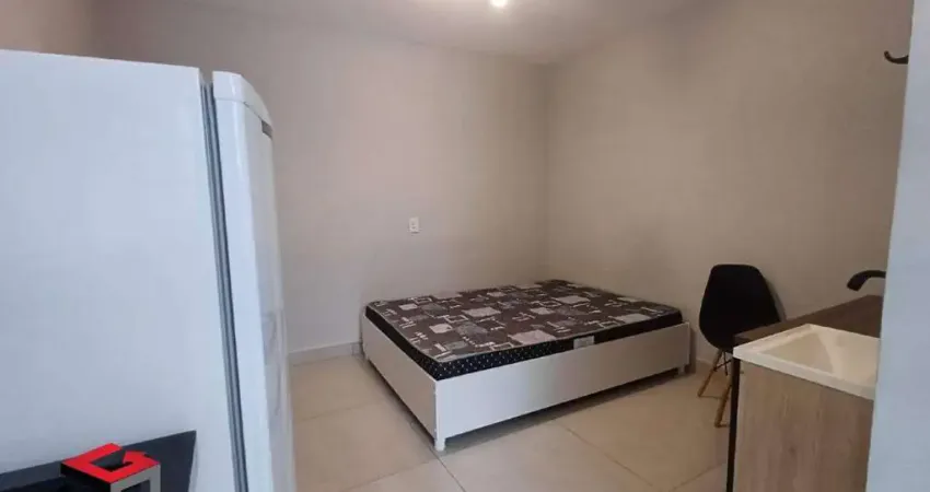 Loft 16m², semi mobiliado, cama, guarda roupa, mesa, fogão elétrico, geladeira, pia com gabinete e nicho.