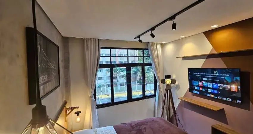 A unidade conta com 1 dormitório, 1 banheiro e 1 sala, proporcionando amplo espaço para seu estilo de vida. O apartamento está totalmente equipado com ar-condicionado, cozinha, armários nos ambientes, carpete de madeira e piso de porcelanato, garantindo conforto e funcionalidade.