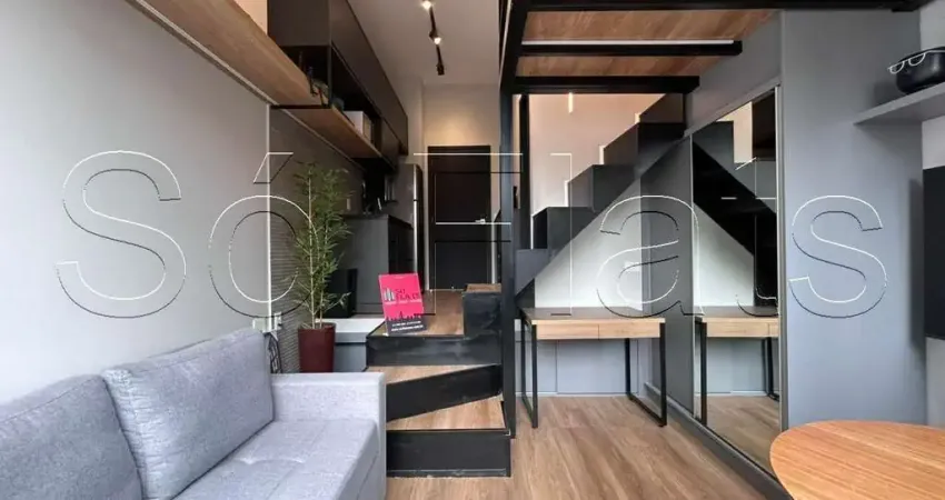 Apartamento no modelo Studio com 24m² distribuídos em 1 dormitório no mezanino, sala com varanda e cozinha americana,