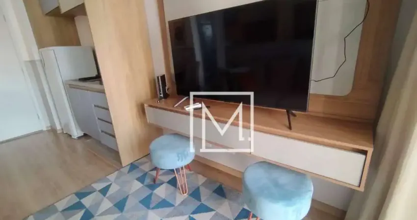 Estiloso apartamento de 1 dormitório 31m², com varanda, totalmente mobiliado, com armários planejados, AR CONDICIONADO e TV na sala.