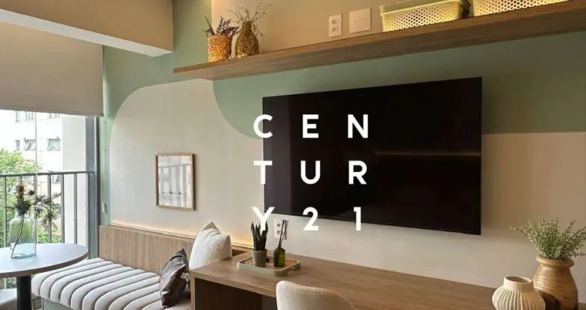 Charmoso layout moderno e inteligente, espaço bem aproveitado, totalmente mobiliado, decorado e com enxoval, fechadura digital, projeto de iluminação, living dormitório com ar-condicionado, sofá 2 lugares, mesa balcão para refeições e home office, cama, colchão, criado mudo, armários, espelho, TV, varanda com fechamento de vidro e cortinas, cozinha com armários, pia com gabinete, cooktop, depurador, microomdas, geladeira, banheiro com fino acabamento, pia com gabinete, espelho, box de vidro temperado e esquadrias de alumínio preto, ótima iluminação natural.