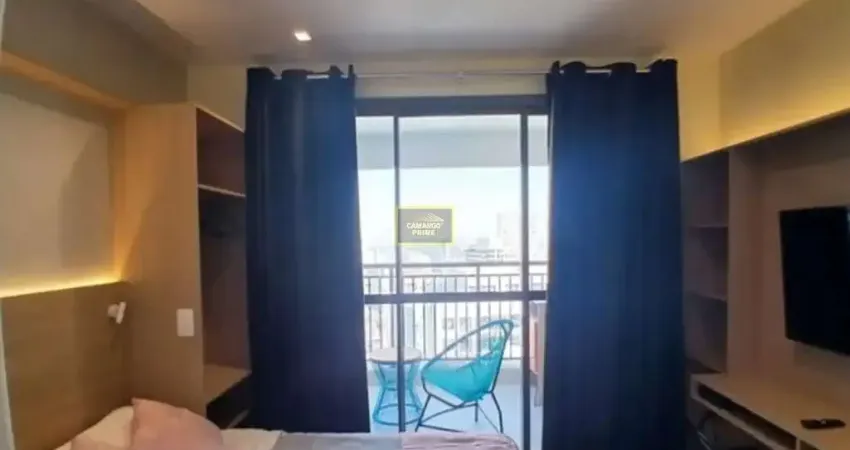 Studio mobiliado para Locação na Vila Madalena com 25 m², com 01 dormitório com cama de casal, 01 TV, bancada, guarda-roupas, mesa de apoio da cabeceira da cama, integrado à varanda com fechamento em vidros e persianas, 01 banheiro com box de vidro, cozinha com refrigerador, micro-ondas, cooktop, armários planejados, ar-condicionado, bem arejado e iluminado.