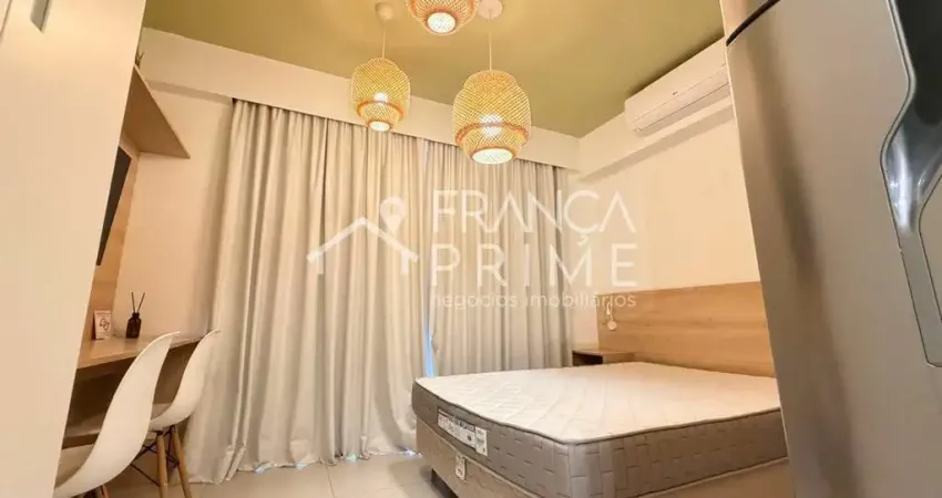 O studio já vem com cortina blackout, cooktop, ar condicionado, fechadura eletrônica, geladeira, TV, microondas, cama de casal, mesa com cadeiras; completinho MOBILIADO e cheio de armários, além de tomadas USB.