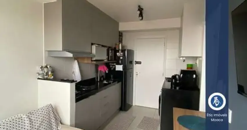 A cozinha conta com móveis planejados e cooktop, garantindo funcionalidade e um visual moderno. A sala é mobiliada com sofá e rack, oferecendo um ambiente agradável para relaxar. No quarto, há um guarda-roupa embutido que otimiza o espaço, e o banheiro possui móvel planejado e espelho, trazendo elegância e praticidade ao dia a dia.
