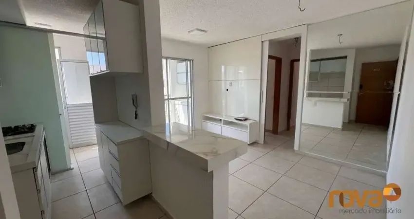 Apartamento com cozinha americana, fogão cooktop, área de serviço separada com acesso a sacada, sala com Painel e rack, dois quartos com armários sendo um suíte, dois banheiros com box, espelho, chuveiro e armários