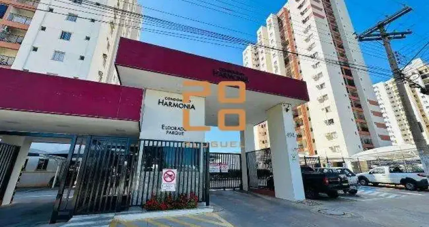 Apartamento mobiliado para alugar no Edifício Residencial Harmonia Eldorado Parque, no Setor Parque Oeste Industrial, com 68,28 m². Possui dois quartos, sendo um suíte com ar-condicionado, ambos com armários e cama; banheiro social; sala com sofá e televisão; sacada com mesa; cozinha repleta de armários, com forno, filtro de água, fogão, exaustor e forno. Área de serviço com máquina de lavar e armário.