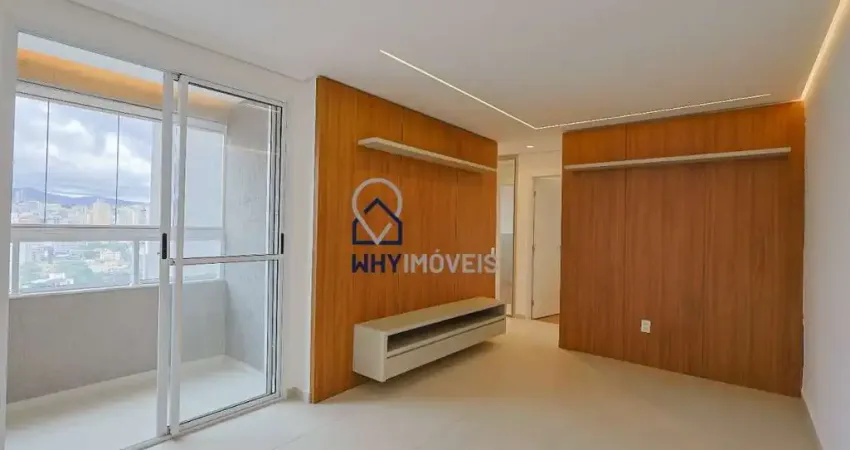Sala ampla e iluminada, marcenaria planejada e ar condicionado, varanda com vista panorâmica.