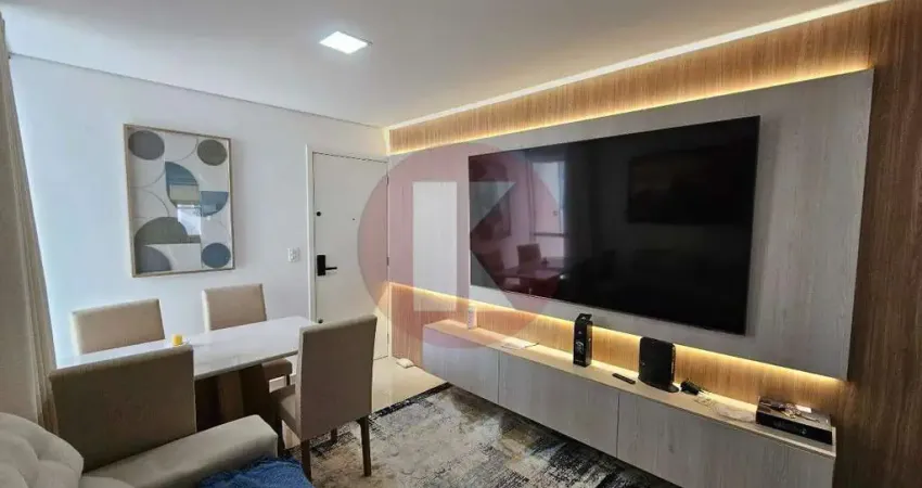 Lindo apartamento composto por 2 quartos, ambos com armários planejados e ar condicionado; sala para 2 ambientes com lindo painel, projeto luminotécnico e ar condicionado; cozinha americana com armários planejados; área de serviço; e banheiro social com armário e box blindex. Dispõe de vaga de garagem coberta e demarcada. Possui elevador.