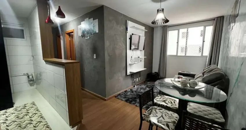 O imóvel conta com 2 quartos, sala aconchegante com painel e TV, sofá confortável e mesa de jantar, tudo já mobiliado e pronto para morar. A decoração traz um toque contemporâneo, com parede em destaque e iluminação que valoriza o ambiente.