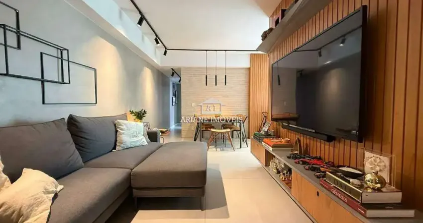 Apartamento, com aproximadamente 77 m², com 02 quartos, sendo 1 suíte, totalmente reformado e moderno, com cozinha americana e painéis de ótimo padrão. 3 banheiros (suíte, banho social e de serviço), 1 sala para 02 ambientes (sala de TV, Jantar e Varanda gourmet) conjugada com a cozinha americana. 2 vagas de garagem livres com ótima área de manobra e box de despejo espaçoso.