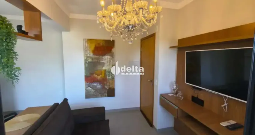 Lindo apartamento mobiliado com aproximadamente 52m² de área privativa no bairro Santa Mônica, composto por sala com painel e rack embutidos, cristaleira, sofá dois lugares e sacada, cozinha conjugada estilo americana planejada com armários, cooktop, coifa, micro-ondas, geladeira, liquidificador e purificador soft, sacada com área de serviço equipada com máquina de lavar, hall para dois quartos com armários, quarto solteiro com cama e sacada, suíte com ar-condicionado, cama de casal, banheiro social e suíte com nichos, chuveiros, box, armários e espelhos, além de TV 48 polegadas e bancada em madeira com duas cadeiras; imóvel com pintura nova, piso em porcelanato, prédio baixo com três andares, portão e porteiro eletrônico, e 1 vaga de garagem.. ref. 48012 atualizado em 01/01.