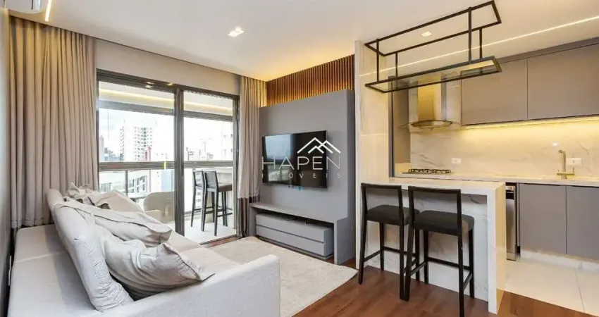 O imóvel possui sacada com churrasqueira e está totalmente mobiliado e equipado com eletrodomésticos, pronto para morar.
