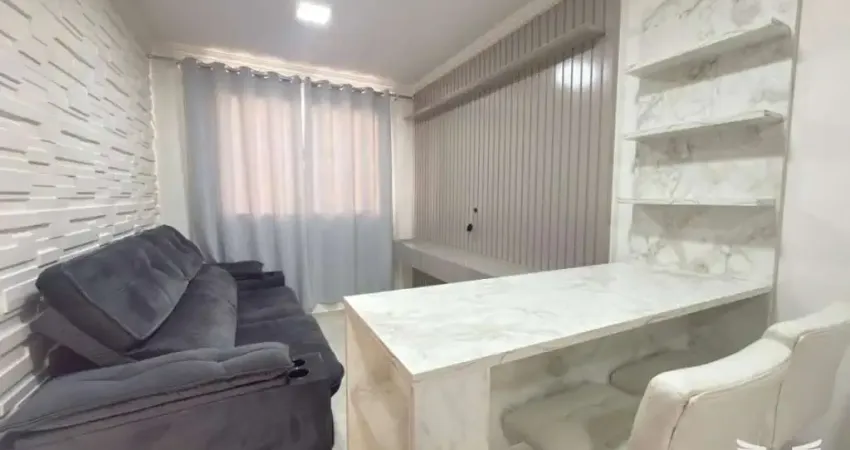 Apartamento com 38,68m2 distribuidos sala para de estar com sofa e painel, cozinha integrada com area de serviço com armarios, mesa fixa com 2 banquetas, lava e seca, cooktop, forno e geladeira, banheiro social com armarios e 2 dormitorios com armarios.