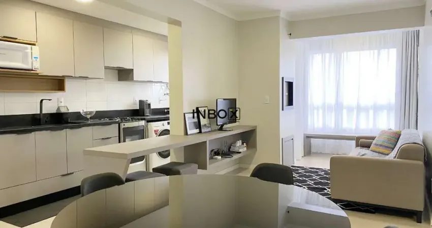 INBOX CIA IMOBILIÁRIA ALUGA: Apartamento pronto para morar de dois quartos, totalmente mobiliado, sala de estar e jantar com sacada integrada, cozinha, área de serviço, churrasqueira, banheiro social e um box de garagem.