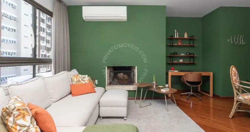 Apartamento mobiliado de 91 m², 2 dormitórios, 1 suíte, living 2 ambientes com lareira, sacada com churrasqueira, banheiro social, cozinha montada e equipada, área de serviço separada e 1 vaga de garagem.