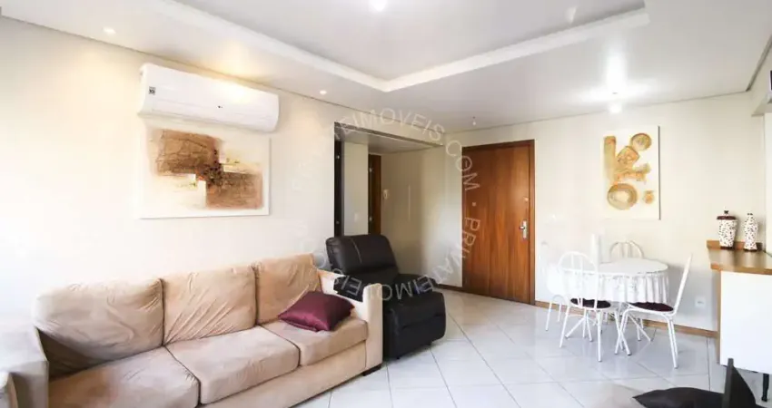 Apartamento semimobiliado de 75 m², 2 dormitórios, 1 suíte, living 2 ambientes, banheiro social, sacada com churrasqueira, cozinha planejada, área de serviço separada e 1 vaga de garagem.