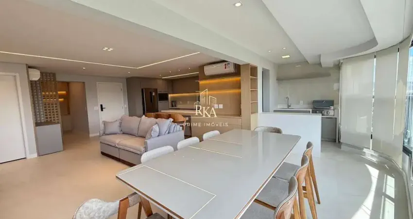 O apartamento conta com 2 suítes espaçosas, sala integrada à varanda, cozinha equipada e mobiliário moderno que valoriza cada ambiente.