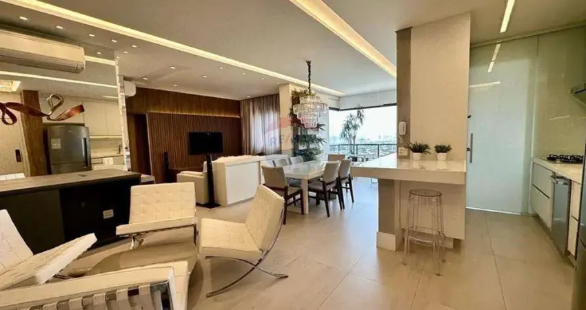 Com 112 m², o imóvel oferece ambientes amplos, bem distribuídos e totalmente mobiliados, com projeto moderno de iluminação e decoração contemporânea. A sala de estar e jantar é integrada, proporcionando elegância e funcionalidade, além de acesso à varanda com vista livre e um pôr do sol espetacular, um dos grandes diferenciais do apartamento.