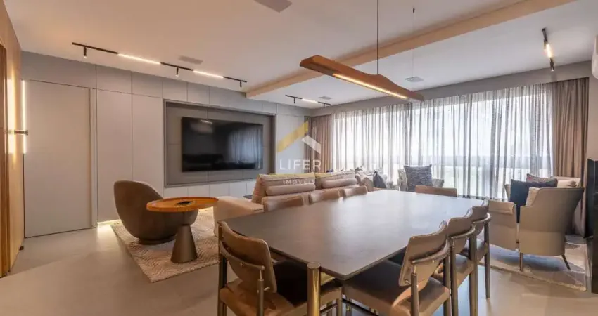 O apartamento possui automação completa, controlando iluminação, ar-condicionado Fujitsu em todos os ambientes, cortinas, blackout, TVs e lareira, além de contar com sistema de som ambiente integrado em todos os cômodos, inclusive nos banheiros. Os acabamentos de alto padrão incluem metais e louças Kohler, indusparquet nos dormitórios e corredor, móveis planejados Florense e peças exclusivas da Artefacto. A área íntima e social ainda é complementada por três vagas de garagem que trazem praticidade ao dia a dia.
