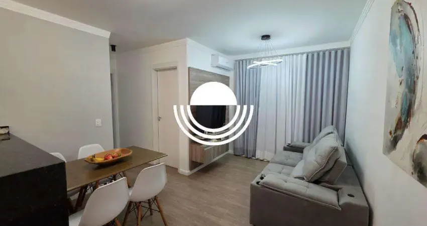 Sala para dois ambientes com sacada e ar condicionado.
