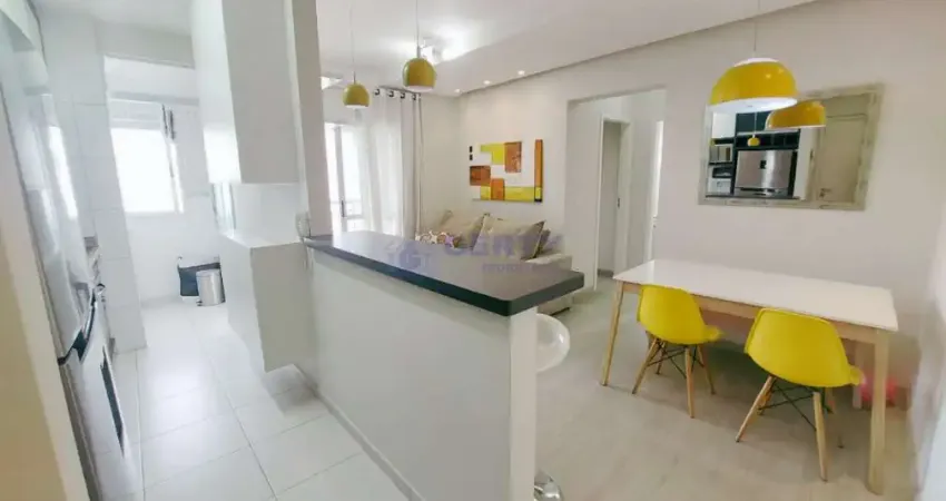 Apartamento moderno e aconchegante mobiliado com dois dormitórios amplos sendo um suíte planejada, um banheiro social, sala ampla planejada com mesa de jantar, TV, hack, sofá, varanda gourmet, cozinha estilo americana planejada com cooktop, forno, coifa, geladeira e micro-ondas, área de serviços planejada com máquina de lavar, uma vaga de garagem coberta, fixa e demarcada.