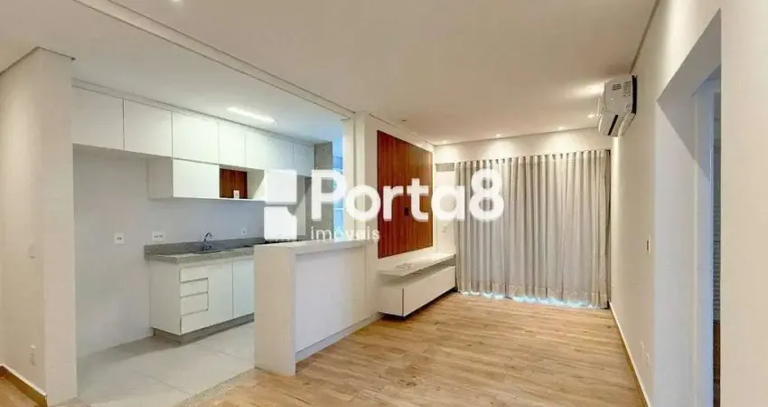 A área íntima oferece dois dormitórios com armários e ar-condicionado, sendo um deles uma suíte que se destaca com closet e sacada privativa, oferecendo conforto e privacidade. Um banheiro social atende ao segundo dormitório e às visitas com praticidade. O imóvel ainda conta com duas vagas de garagem, um diferencial que valoriza a mobilidade e comodidade dos moradores.