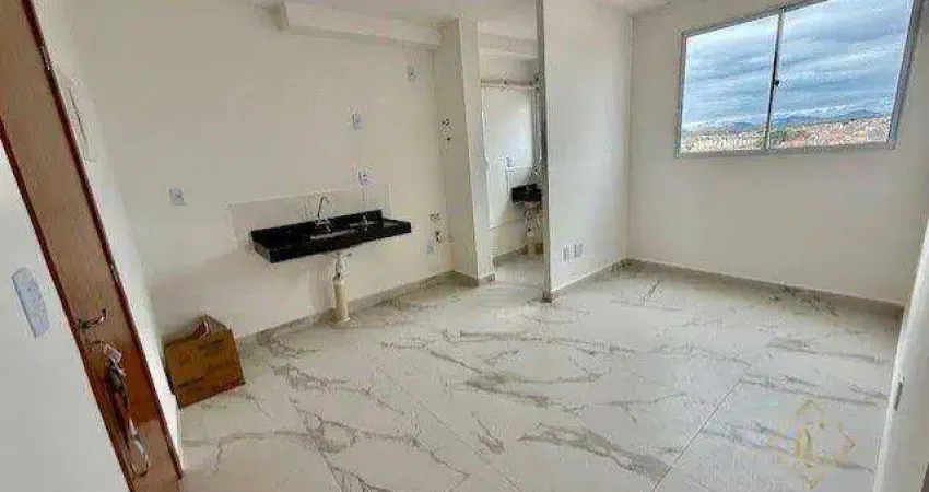 Sala e cozinha integrada, acabamento diferenciado, 1 vaga descoberta e portaria 24h.