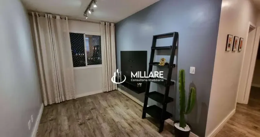 O apartamento possui móveis planejados na cozinha, banheiro e quarto, com 2 portas de correr com espelho. Box de vidro no banheiro.